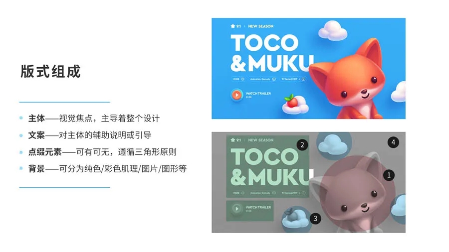 主體和文案組合的形式可以是圓形,三角形,矩形等形狀構(gòu)圖。注意如果是用三角形構(gòu)圖,最好呈倒金字塔結(jié)構(gòu),這樣更加輕便引導(dǎo)用戶進(jìn)入下一個(gè)信息層。