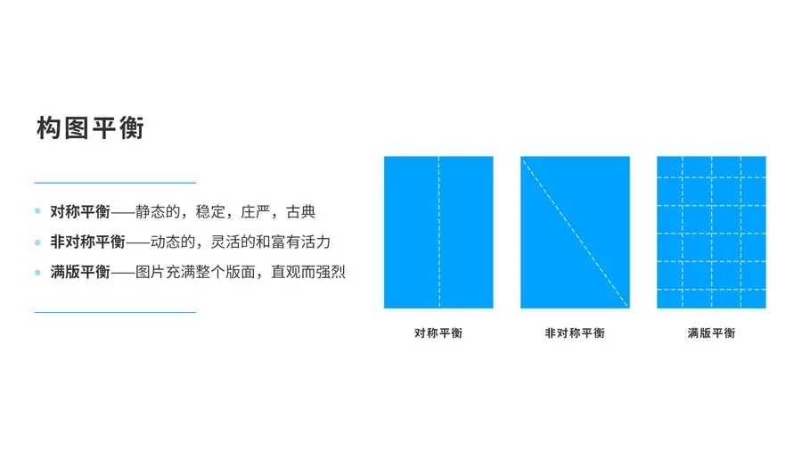 非對(duì)稱在不對(duì)等的元素間創(chuàng)設(shè)出秩序和平衡,非對(duì)稱設(shè)計(jì)由于版式不可預(yù)見(jiàn),所以空間是變化的。特點(diǎn)是動(dòng)態(tài)的,靈活的和富有活力。非對(duì)稱構(gòu)圖比較多,常見(jiàn)的有以下6種形式。
