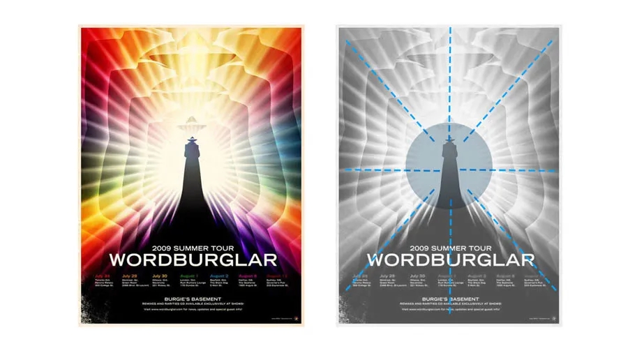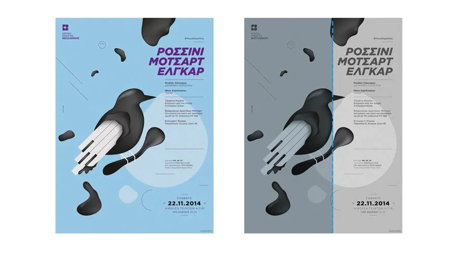 文案擺放在版面的對(duì)角線方向,一方面避免了司空見(jiàn)慣的居中版面,一方面給中心主體留出了更多的創(chuàng)作空間;另外中心的圖形也可以是對(duì)角線的設(shè)計(jì),這樣會(huì)讓整個(gè)構(gòu)圖看起來(lái)比較平衡。
